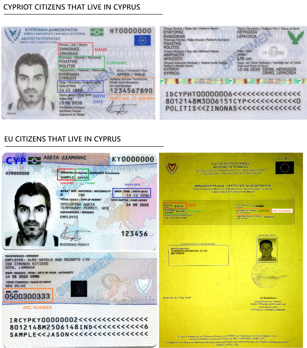 Οι Κύπριοι πολίτες θα ταυτοποιούνται με την Κυπριακή αστυνομική ταυτότητα (αριθμός ταυτότητας) και την ημερομηνία γέννησης. Για Ευρωπαίους πολίτες που διαμένουν μόνιμα στην Κύπρο και είναι δικαιούχοι των υπηρεσιών, η ταυτοποίηση θα πραγματοποιείται μέσω του αριθμού της Άδειας Παραμονής ή του αριθμού του Alien Registration Certificate (ARC) σε συνδυασμό με την ημερομηνία γέννησης.
