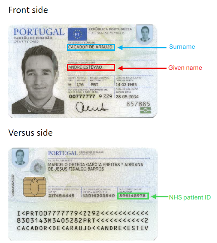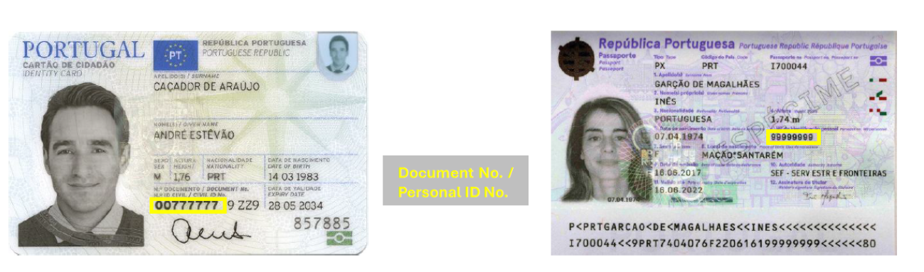 Τα ταυτοποιητικά έγγραφα του Πορτογάλου πολίτη είναι η Κάρτα Πολίτη και το Διαβατήριο. Στο πίσω μέρος της Κάρτας Πολίτη αναγράφεται το Αναγνωριστικό Ασθενή στη θέση "No Documento / Document No", ενώ στο Διαβατήριο στη θέση "Nº de identificação pessoal / Personal no".