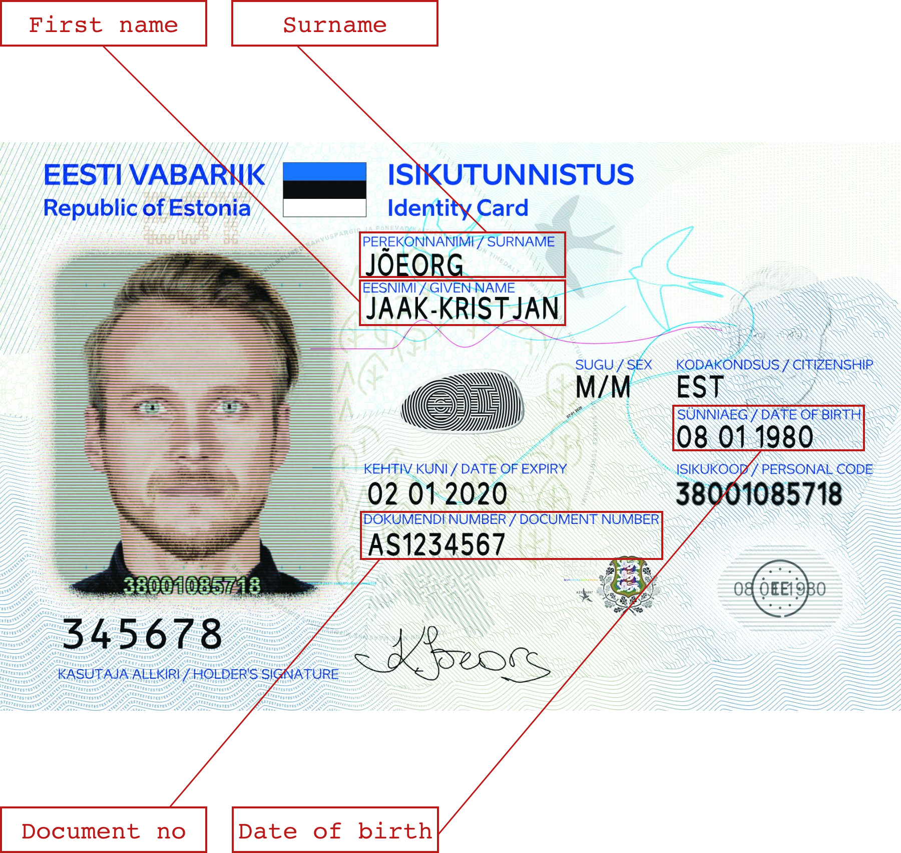 Το αναγνωριστικό ασθενή του Εσθονού πολίτη είναι ο προσωπικός κωδικός αναγνώρισης (11 ψηφία), ενώ τα ταυτοποιητικά έγγραφα που δ΄ύναται να επιδεικνύει είναι η ταυτότητα ή το διαβατήριο, τα οποία φέρουν τη φωτογραφία του. Η ταυτότητα έχει και νέα μορφή, η οποία διαθέτει πλέον έγχρωμη φωτογραφία και κάποιες αλλαγές στη διάταξη συνολικά.
