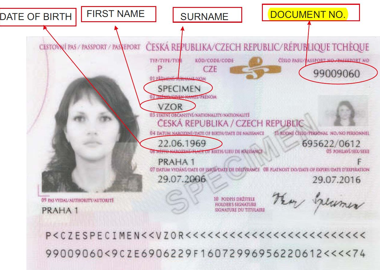 Τα ταυτοποιητικά έγγραφα του Τσέχου πολίτη είναι η Κάρτα Πολίτη και το Διαβατήριο, τα οποία φέρουν ως αναγνωριστικό ασθενή τον αναγραφόμενο στη θέση "DOCUMENT NO" αριθμό.